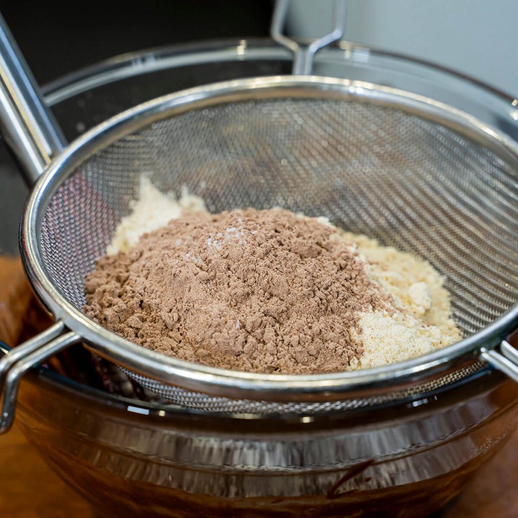 5. Tamiza la harina de castañas, el cacao en polvo y la pizca de sal sobre la mezcla y revuelve con movimientos envolventes hasta que todo esté bien integrado.